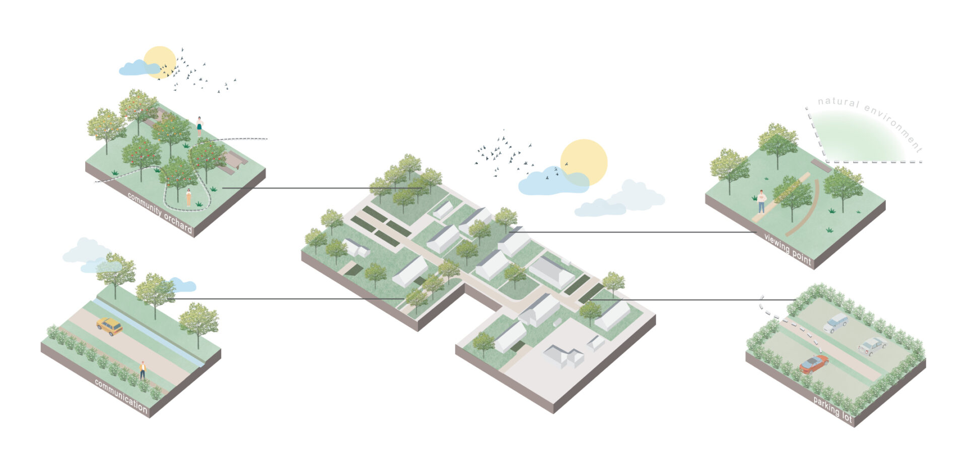 Between the houses lies a communal yard, serving as a meeting place for residents and fostering social cohesion. In addition, space has been reserved for a shared vegetable garden and a play meadow, giving the area not only a residential function but also opportunities for community activities and a child-friendly living environment.